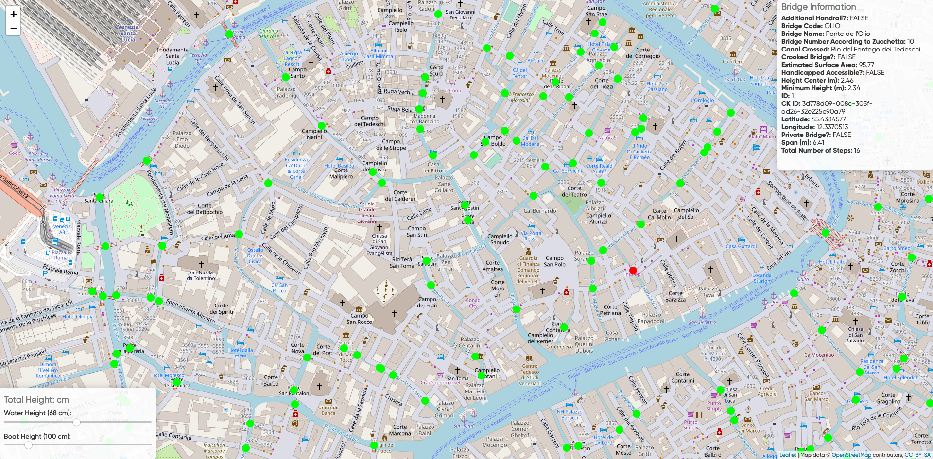 This application displays the location of all of the bridges in Venice, as well as their outline and information on a selected bridge. The map also displays which bridges are passable (green) or impassable (red) for boats of various heights at different sea levels. The sea level on the map defaults to the most recent water height measurement.